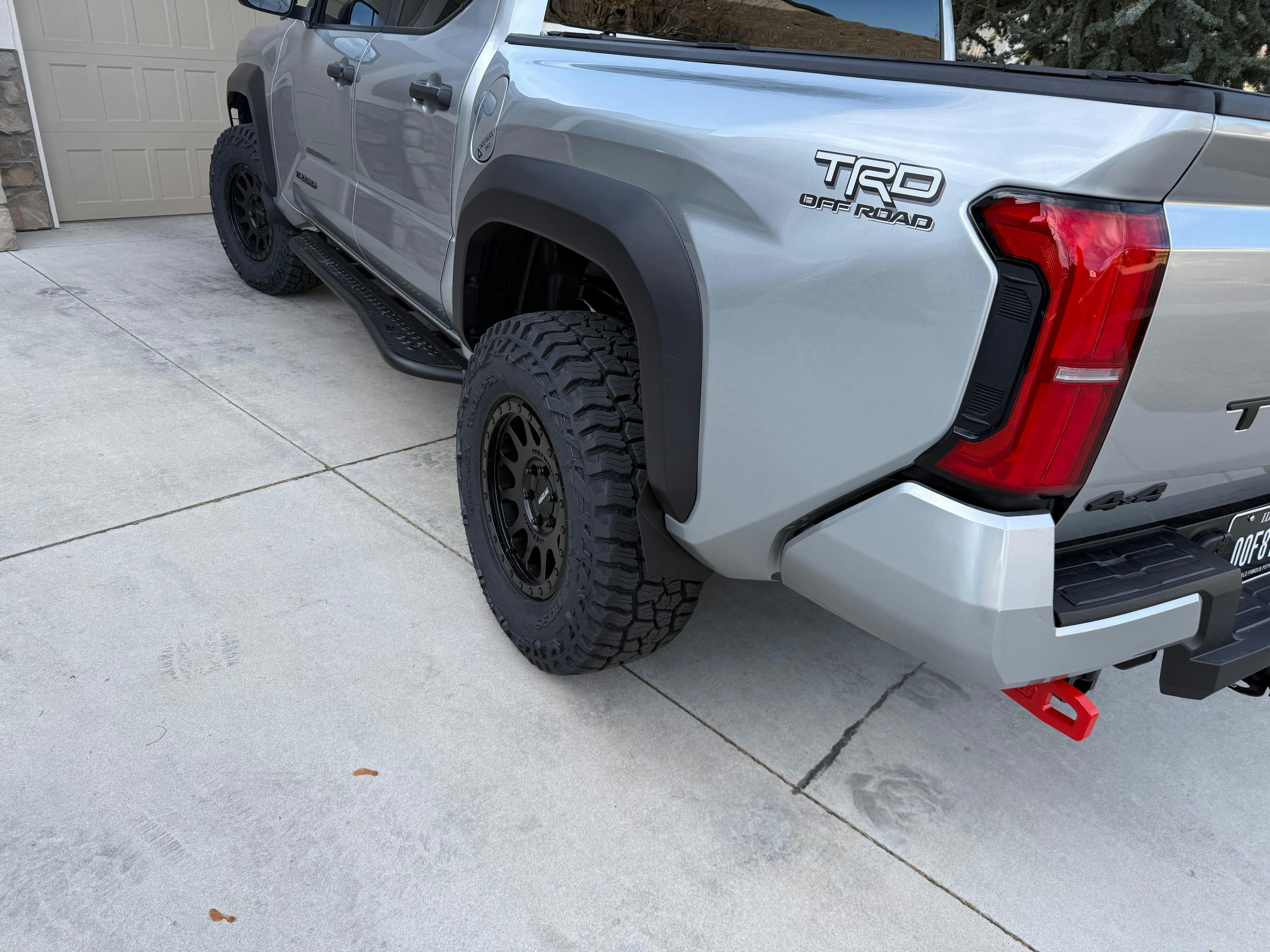 Innovative Mud Flaps Our unique 'Mudflaps' enhance protection by minimizing the debris and mud flung onto your 4th Gen Tacoma's doors from the exposed tire treads. These Mudflaps are far from ordinary; they are not just any universal, flimsy rubber pieces hastily assembled. They are custom-designed specifically for the 2024+ Tacoma.