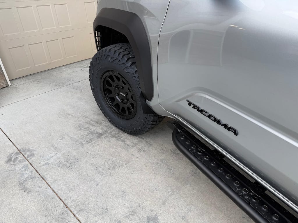 Innovative Mud Flaps Our unique 'Mudflaps' enhance protection by minimizing the debris and mud flung onto your 4th Gen Tacoma's doors from the exposed tire treads. These Mudflaps are far from ordinary; they are not just any universal, flimsy rubber pieces hastily assembled. They are custom-designed specifically for the 2024+ Tacoma.